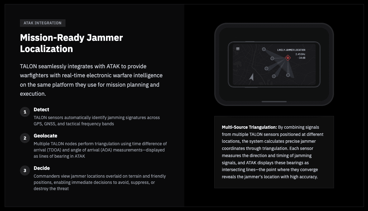 Tactical electronic warfare platform with native ATAK integration for real-time jammer localization. TALON enables warfighters to detect, geolocate, and neutralize RF threats using proven bisection and resection techniques - all displayed on familiar Android tactical interfaces. Combining military-grade signal intelligence with the Android Team Awareness Kit (ATAK), TALON delivers actionable EW intelligence directly to operators in the field, enabling immediate tactical decisions to maneuver around or engage jamming sources.
